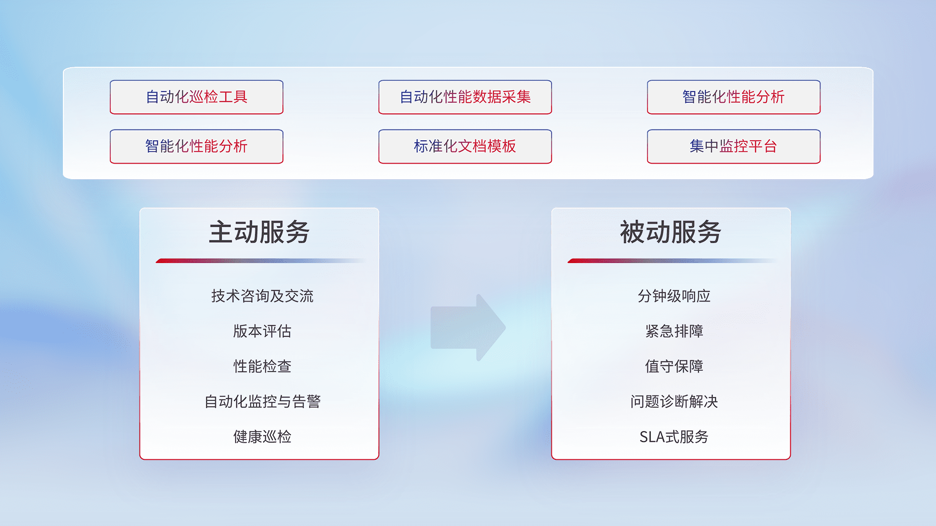 智能化工具和标准化文档,,,保障服务质量,,,,提供主动服务(包含技术咨询、、版本评估、、、、性能检查、、自动化监控与告警、、、健康巡检)和被动服务包含(分钟级响应、、紧急排障、、值守保障、、、、问题诊断解决、、、SLA服务)。。。